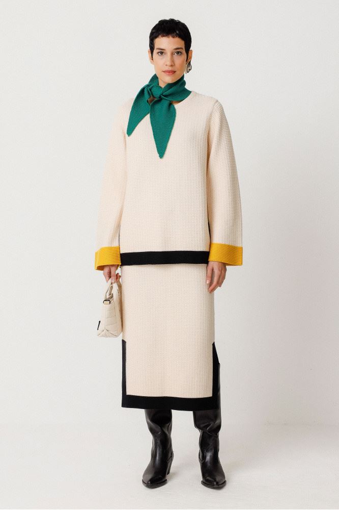 Caldo maglione svasato dalla vestibilità regolare e dalla costruzione pesante con scollo rotondo e maniche lunghe svasate.Composizione: 100% cotone biologico certificato GOTS.